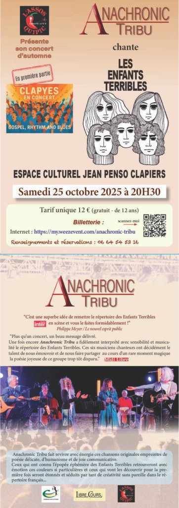 Samedi 25 octobre 2025 à 20h30 à Clapiers, Clap’Yes a assuré la première partie du concert « Anachronic Tribu chante les Enfants Terribles » organisé par l’Assos Qui Pic.